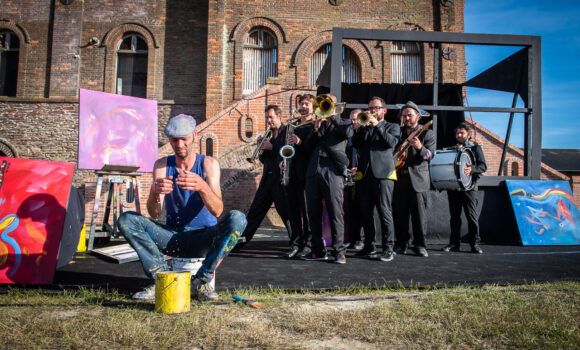 FLOK tient de l’averse de sons et d’images, tantôt douce, tantôt tempétueuse. Et toujours poétique. Un échafaudage, des toiles, quelques chevalets, huit musiciens et un peintre pour un spectacle musical qui imprègne les yeux et les oreilles. Un groove de macadam qui fait résonner le pavé de ses compositions originales mêlant jazz, funk, New Orleans. Des spectacles qui font se dandiner postérieurs et zygomatiques.